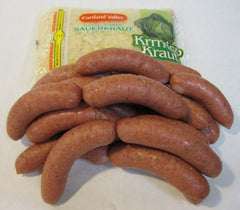 Kern's Homemade Knackwurst are short, plump pork and beef sausages seasoned with garlic and black pepper in a natural casing. Our knackwurst are hand-linked, hickory smoked and pre-cooked. Simmer to heat and serve with the crisp, bold flavor of barrel cured sauerkraut included for a Bavarian-style dinner.