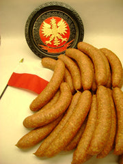 5 lbs. of Kern’s Homemade Smoked (Uncooked) Polish Sausage. An all pork sausage with a hint of garlic, red pepper, and sweet marjorum. (approx. 20 links)